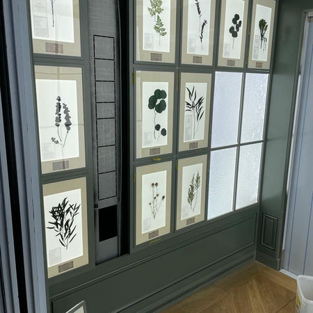 A bespoke installation of LED back lit wall panelling with individual pressed flower picture panels, back lit ceiling panel and flush fitted car operation panel